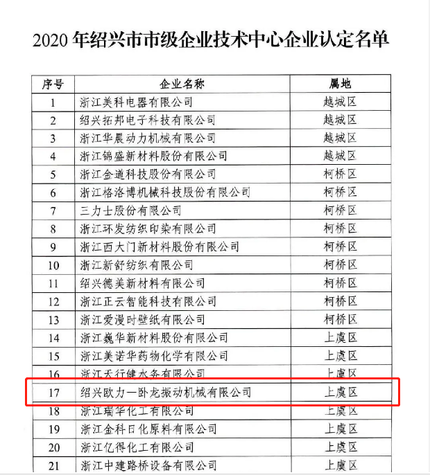 歐力-臥龍振動機械企業(yè)技術中心已于2013年10月12日被認定為省級高新技術企業(yè)研究開發(fā)中心,此次入選紹興市市級企業(yè)技術中心,是對企業(yè)技術能力的再一次認可。未來,歐力-臥龍將進一步遵循加強企業(yè)技術中心建設的指導,完善企業(yè)技術創(chuàng)新體系,不斷提升企業(yè)的技術創(chuàng)新能力,力爭引領推動產業(yè)創(chuàng)新發(fā)展。